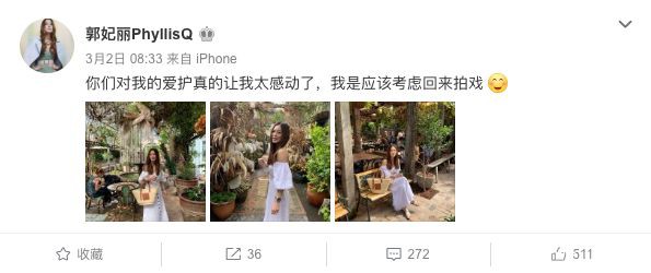 面对粉丝们排山倒海的爱,郭妃丽在自己的微博上表达了感动,甚至在考虑重新回来拍戏~