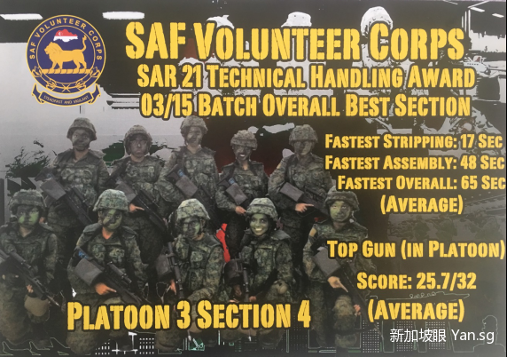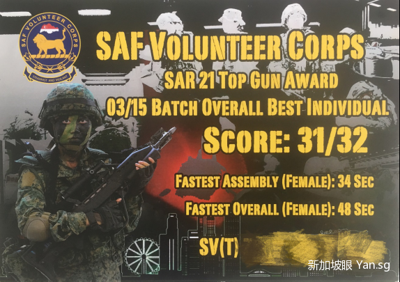 两天的枪支训练结束后,我以31/32的命中成为三个排的Top Gun;组装枪用了34秒,是女兵排中最快的,男兵排里能与俺一战的寥寥数人;拆卸也不赖,最终以总成绩48秒拿到了女兵排的总体第一(貌似在男兵排也是第一),这个成绩让我成了03/15 Batch overall best individual,并且所在班级是03/15届的Best Section。怎么样宝宝是不是好棒棒?快给宝宝给糖糖~
