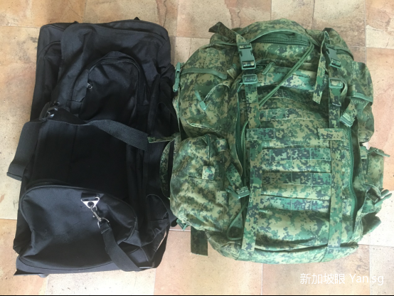 入伍的第一天我们收到了两大包价值1000新币以上、重约30斤的军用物品。因为训练时间短,军服的数量较少,除此之外我们拿到的装备和全民服役人员的没有区别。