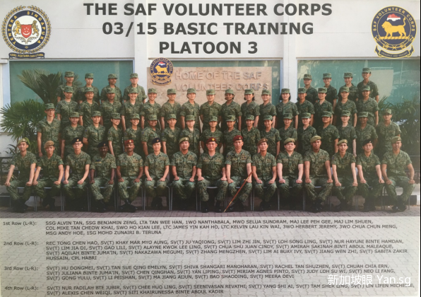 ▲这是我们第三排的合照,左起第八位为Mike Tan上校,他右边持手杖的是志愿军总教官Ho Kian Lee,坐在第六位的女军官是Lee Peh Gee少校,左起第一位是我们可爱萌萌哒的Section Commander Alvin 上士。