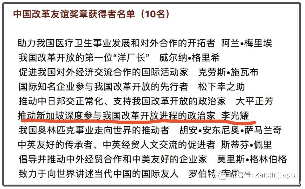 中国改革开放四十年表扬的十个外国人,李光耀名列其中。