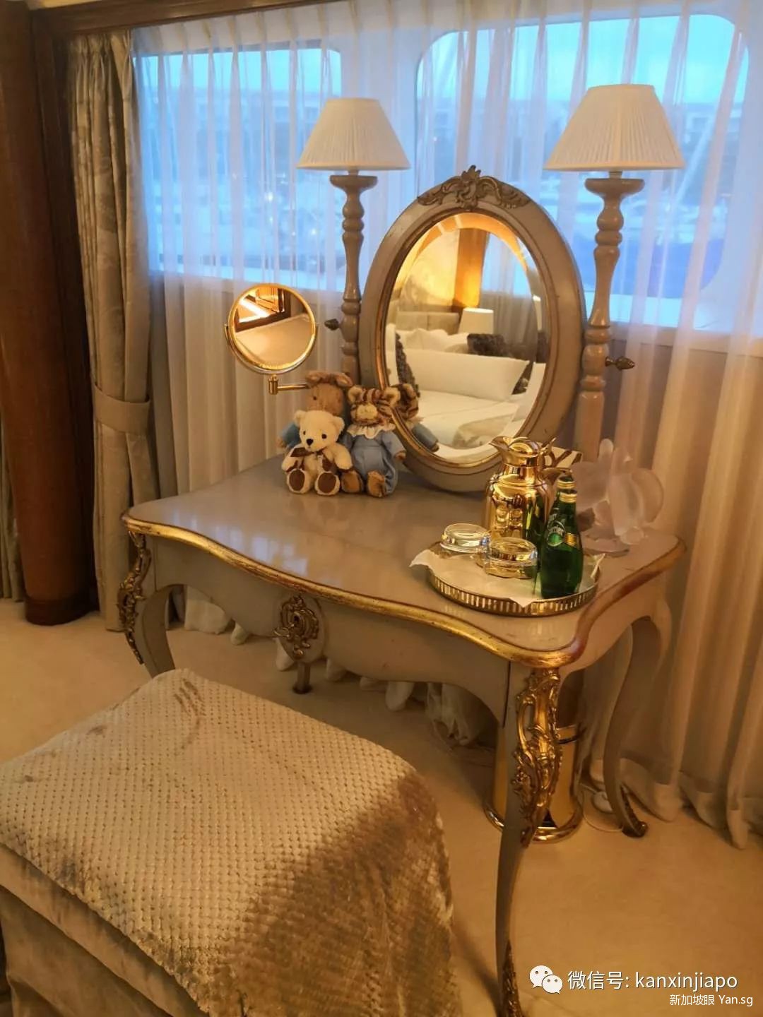 游艇内的卧室还有精致的梳妆台,出海时,一边化着妆,台头就能看到窗外的海景,这样的装潢,也是非常浪漫又用心了。