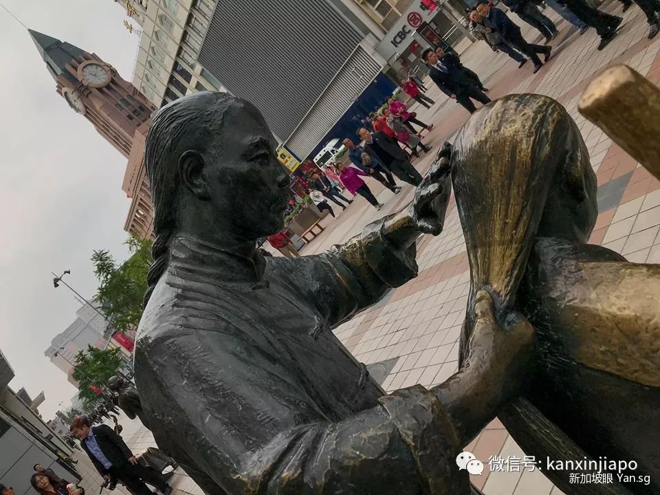 王府井很火的“剃头挑子”的铜像吸引了他的注意。从“客人”的脑袋锃明瓦亮的程度看来,应该没少被人摸过,亮到晃眼的脑袋必须来张特写~