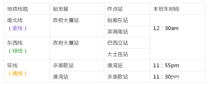 地铁环线(黄线)、南北线(红线)和东西线(绿线)的末班车,都推迟到劳动节前夕(4月30日)晚上11点半以后发出。具体调整如下: