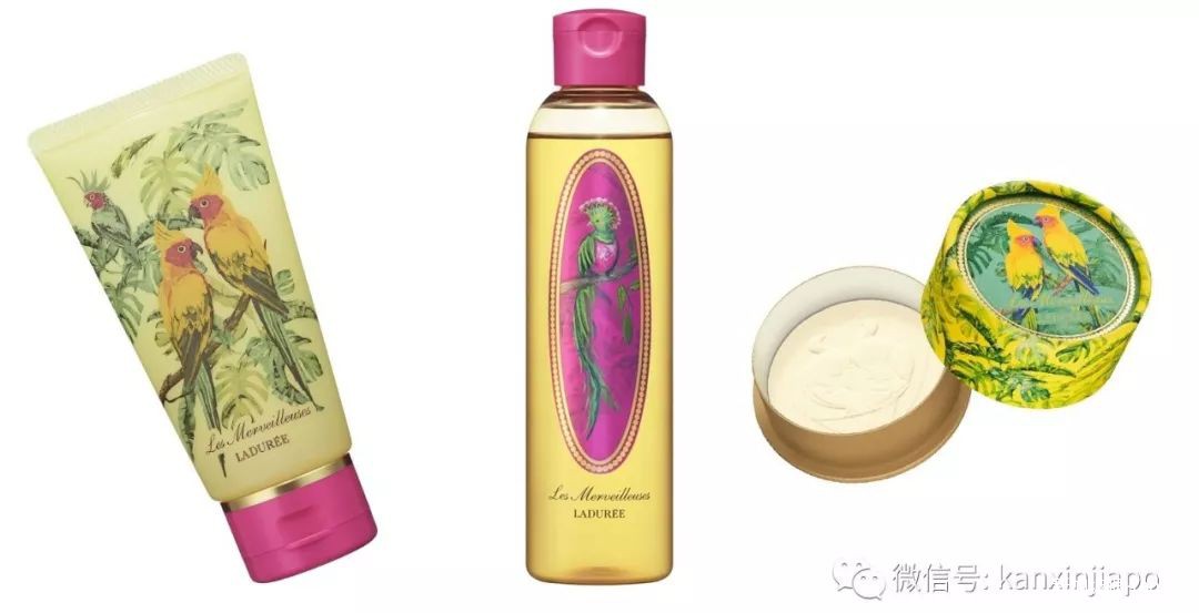 (从左至右:热带滋润霜、热带沐浴露、热带爽身粉)