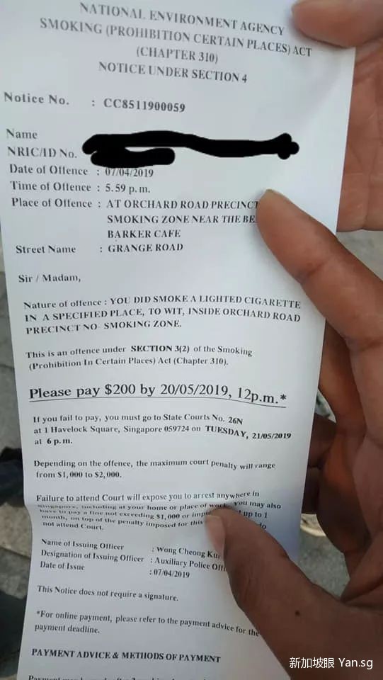 一位烟民在FB上爆料,由于自己站在吸烟区吸烟时,一只脚踩在了黄线区域外,就被罚款了200新币(约合1000人民币)!