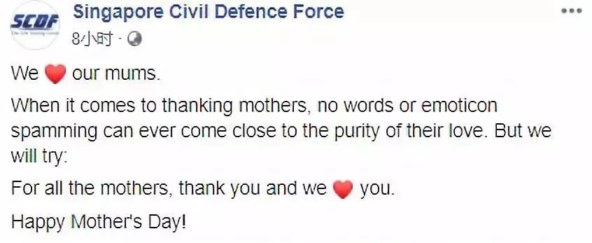 新加坡民防部队则拍摄了一个短视频,感谢母亲这些年对孩子的付出。