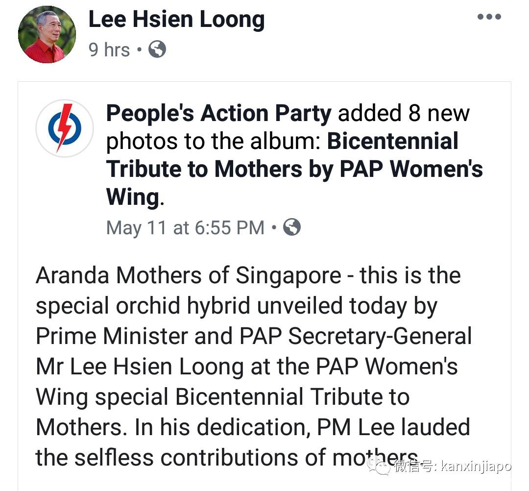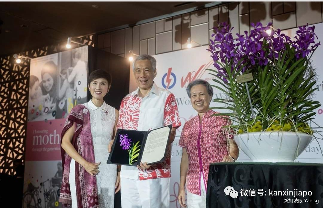 新加坡“第一网红”李显龙也“不遑多让”,分享了他昨天参加人民行动党举办的母亲节晚宴的照片。晚宴上,亮相的新品种胡姬花被命名为“狮城之母蜻蜓万代兰”,以此祝福天下所有妈妈节日快乐!