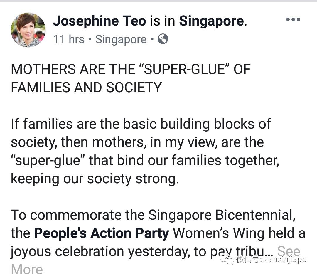 人力部长和内政部第二部长杨莉明昨天也出席了人民行动党母亲节晚宴,她在贴文中,将母亲类比成一个家庭中的“强力胶”,不仅维系了家庭的纽带,也使得新加坡社会更加团结、强大。