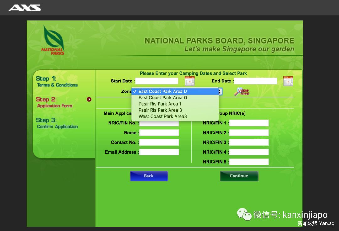 同意条款后,申请者要选择自己想要露营的地点、露营开始和结束的时间、主申请人的IC号码等。