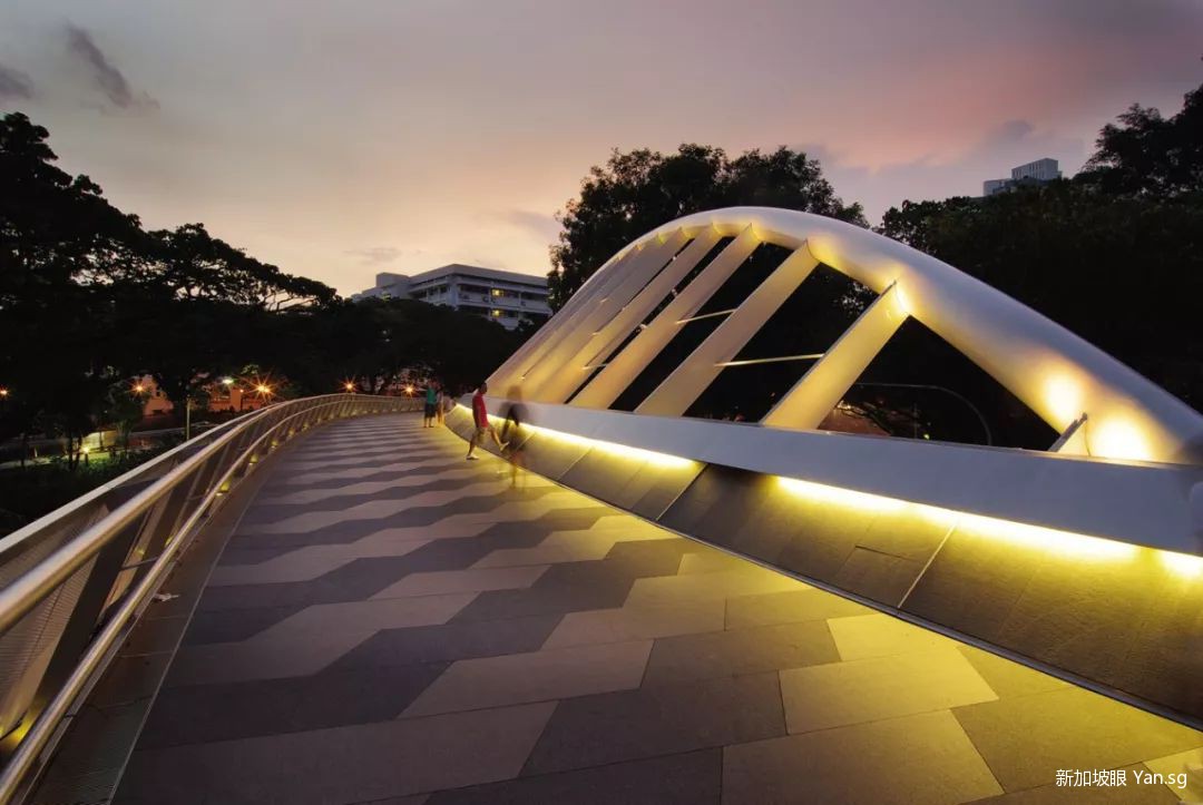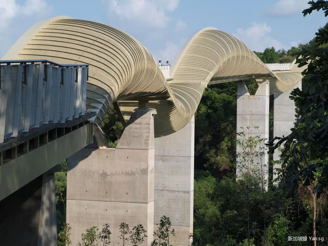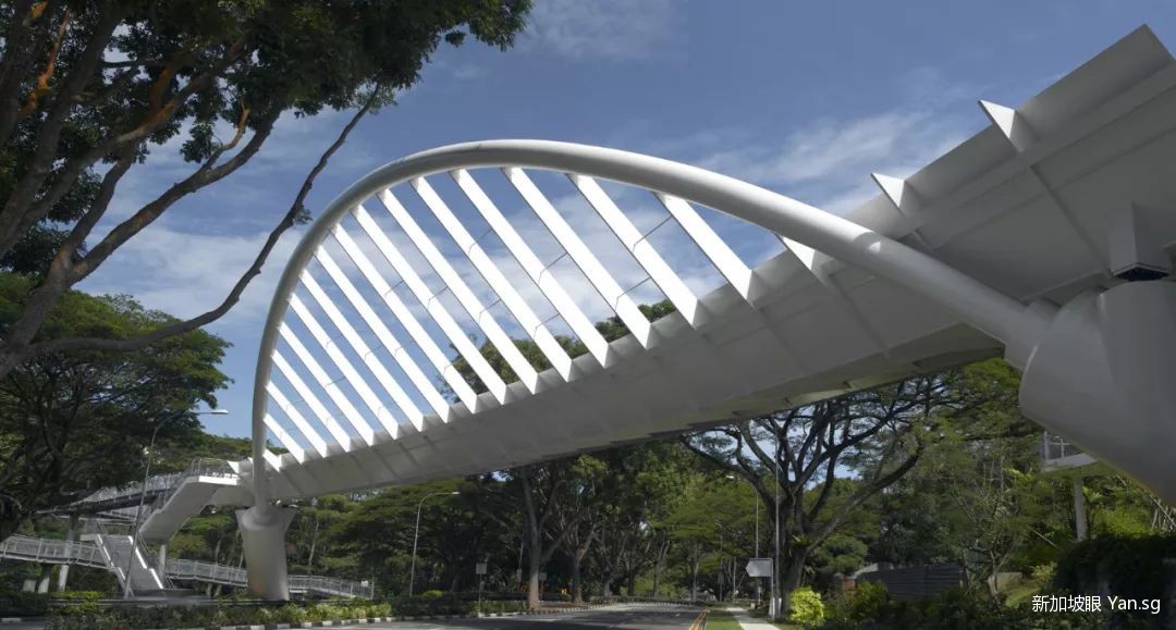这是一座将两侧的城市绿地园艺园林(Hort Park)和丛林小径(Forest Walk)连接起来的人行天桥。最大的亮点在于整座桥的设计,弧形的桥身和倾斜的拱架,让它宛若一片巨型叶子,与旁边的绿地相互映衬。