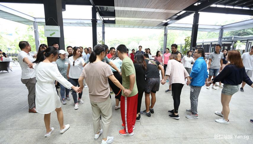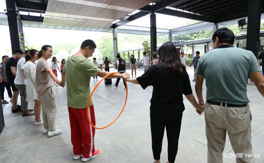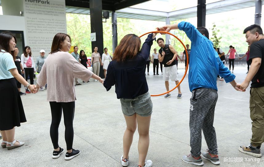 熟络之后,主持人给大家出了一个难题,让大家手拉手,从一个呼啦圈里穿出来~