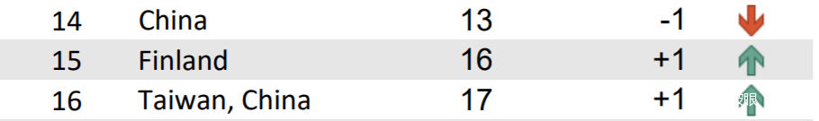 榜单中亚太区经济体表现优异。除了分居前两名的新加坡,香港外,中国大陆在全球排第14位,亚太国家中排名第3;台湾则以第16名在亚太国家中排名第4。