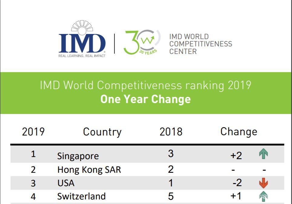 今天(5月29日),瑞士洛桑国际管理发展学院(IMD)发布了《2019年世界竞争力年鉴》,新加坡取代去年排名第1的美国,成为全球最具竞争力的经济体。