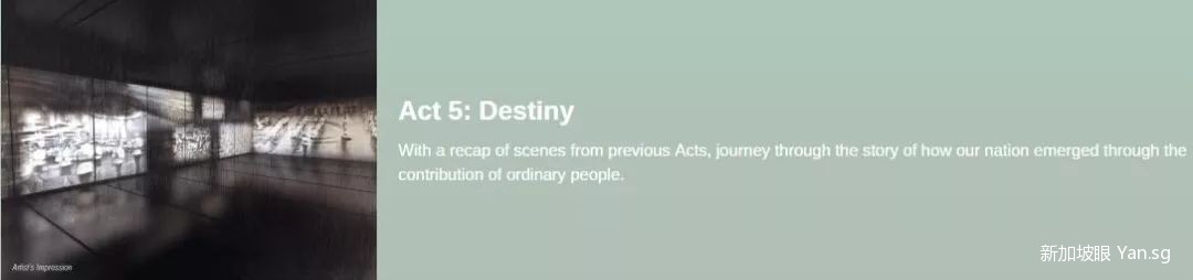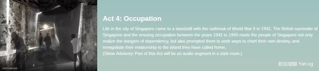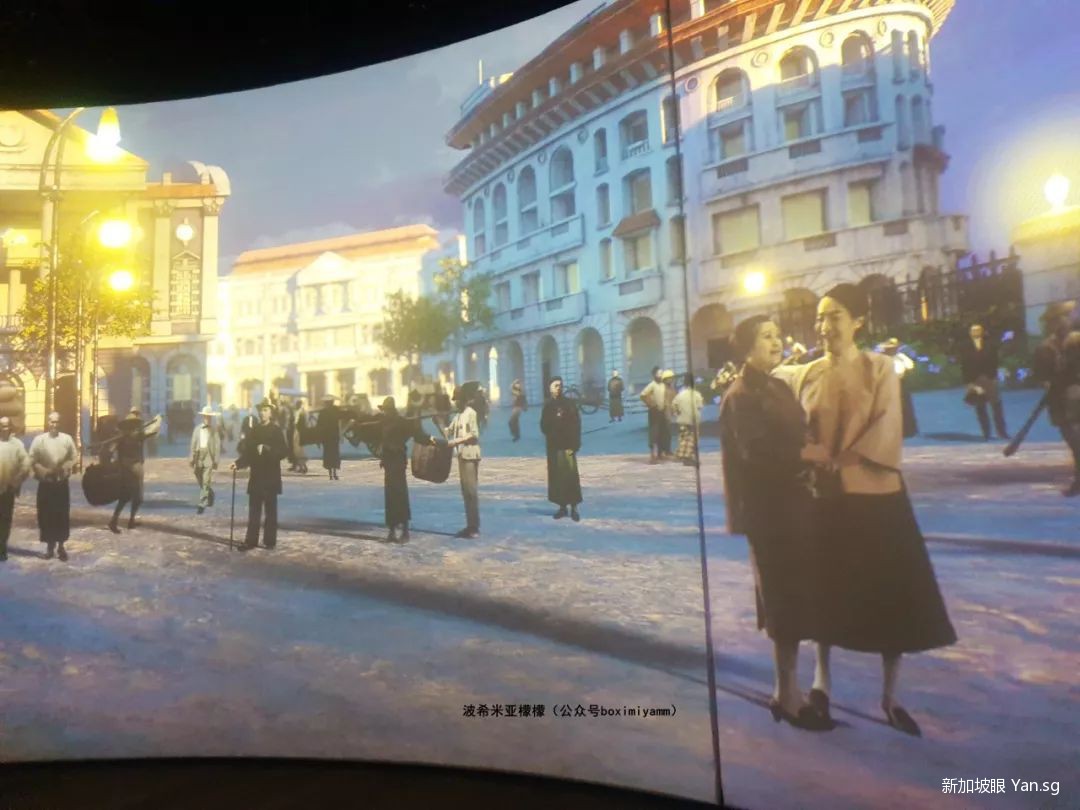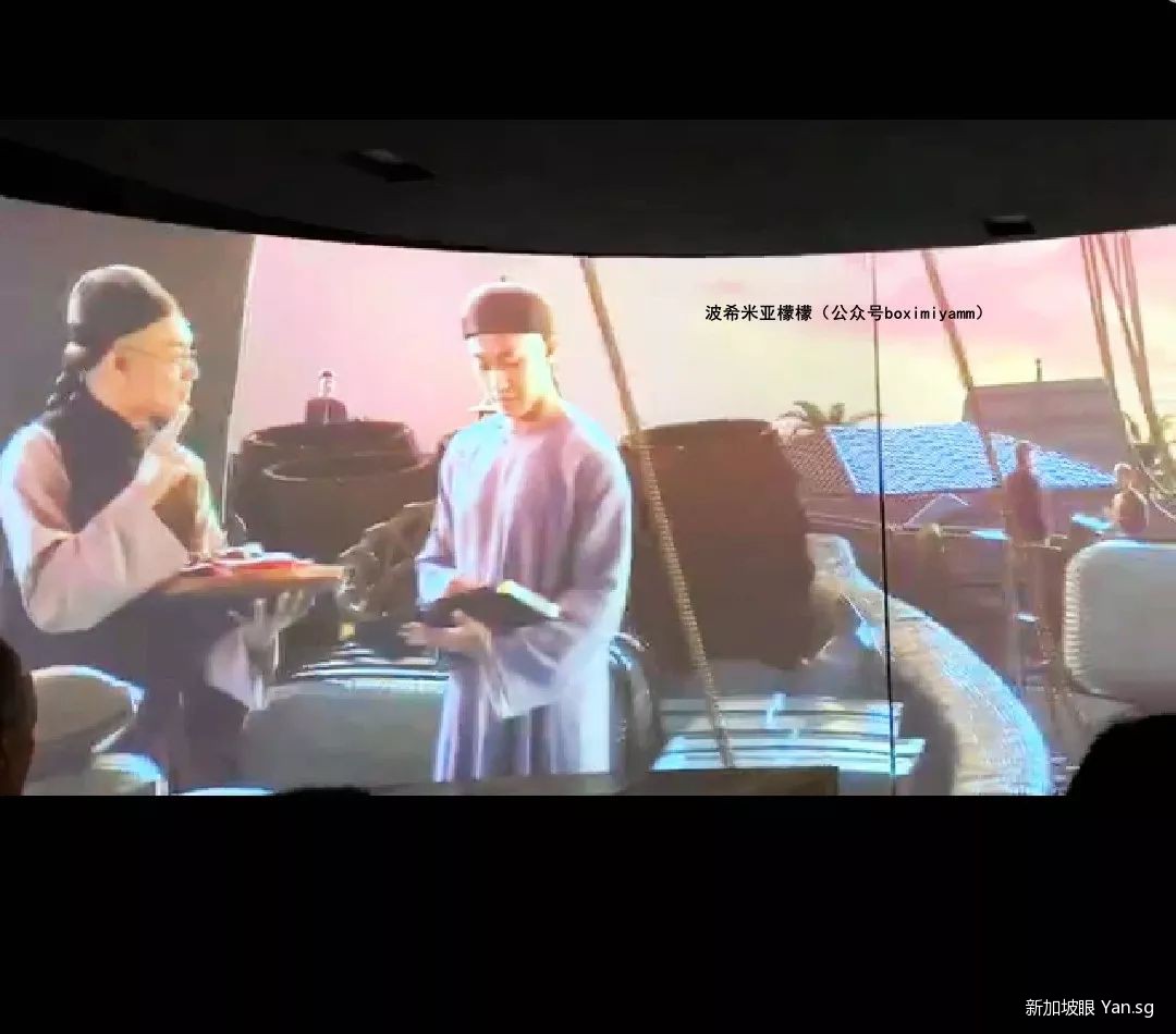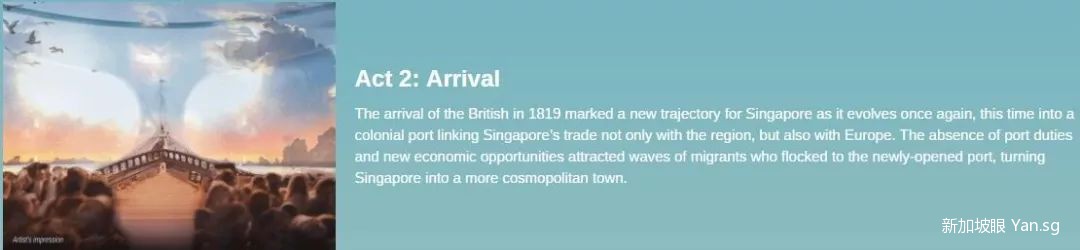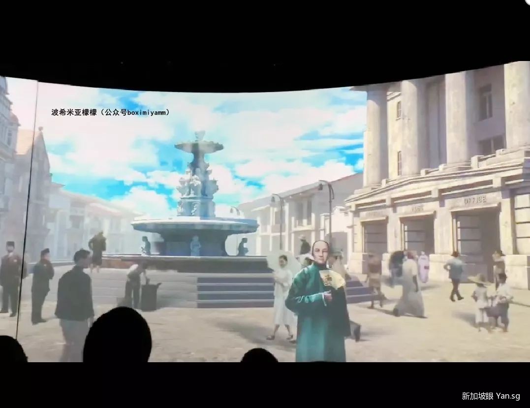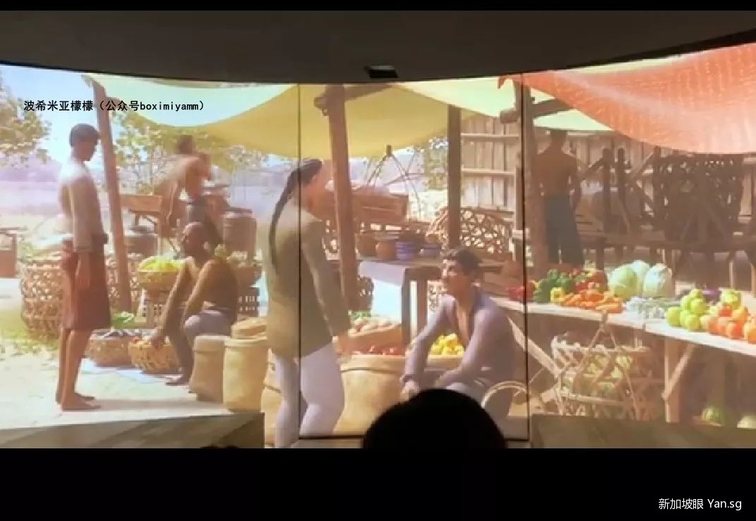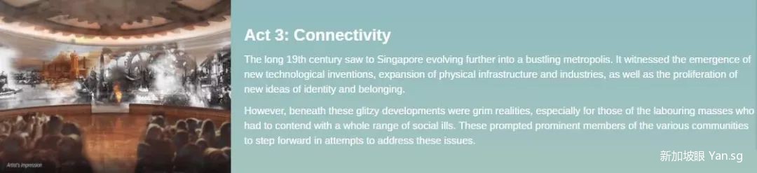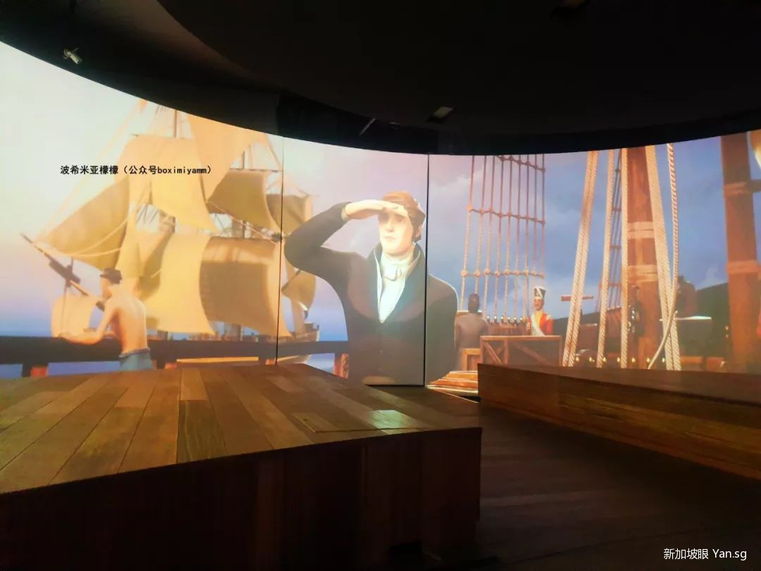 英国人的到来,使新加坡进入了全新的发展时期,不仅成为海上的交通枢纽,而且贸易和关税的灵活性,也使它更加迈向国际型的都市。从长形剧场一路深入至圆形剧场,360度旋转的幕布,时而开放,时而合并,配合紧张的剧情,彷佛能感受到阳光照在莱佛士脸颊的温度,也能闻到那弥漫在房间内的香料气味,更能触手可及那花花世界的歌舞升平。