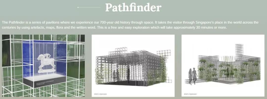 在历史寻踪这一部分,设置了八个装置艺术,分别代表不同的主题,它们是东方商业中心、地图之屋、种子温室、万花筒、往事倒影、光束、开放图书馆、瞭望台、回声。反映了新加坡不同历史时期扮演的角色,以及如今的新加坡特色。