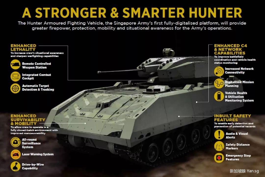 2006年新加坡开始自主研发下一代装甲运兵车“猎人”,由国防科技局(DSTA)、陆军和ST工程部共同研发。