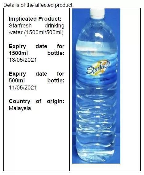 昨天(6月12日),新加坡食品局宣布紧急召回从马来西亚进口的“Starfresh”瓶装水!