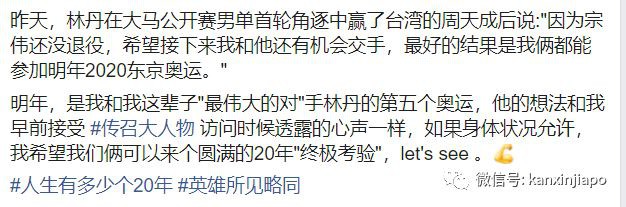今年4月份,林丹参加马来西亚公开赛,记者问为何35岁还要继续打球。林丹深情地说“老对手李宗伟也还没有退役,所以希望后面的比赛有机会还能一起比赛”。