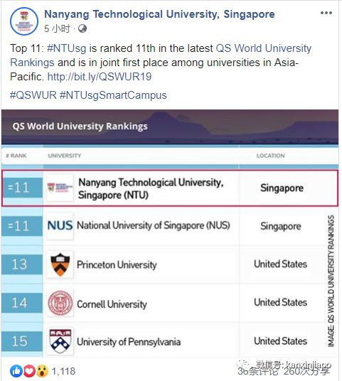 南洋理工默默前进,今年终于和国大“平起平坐”。消息一出,南大在官方脸书上给自己点了个赞~