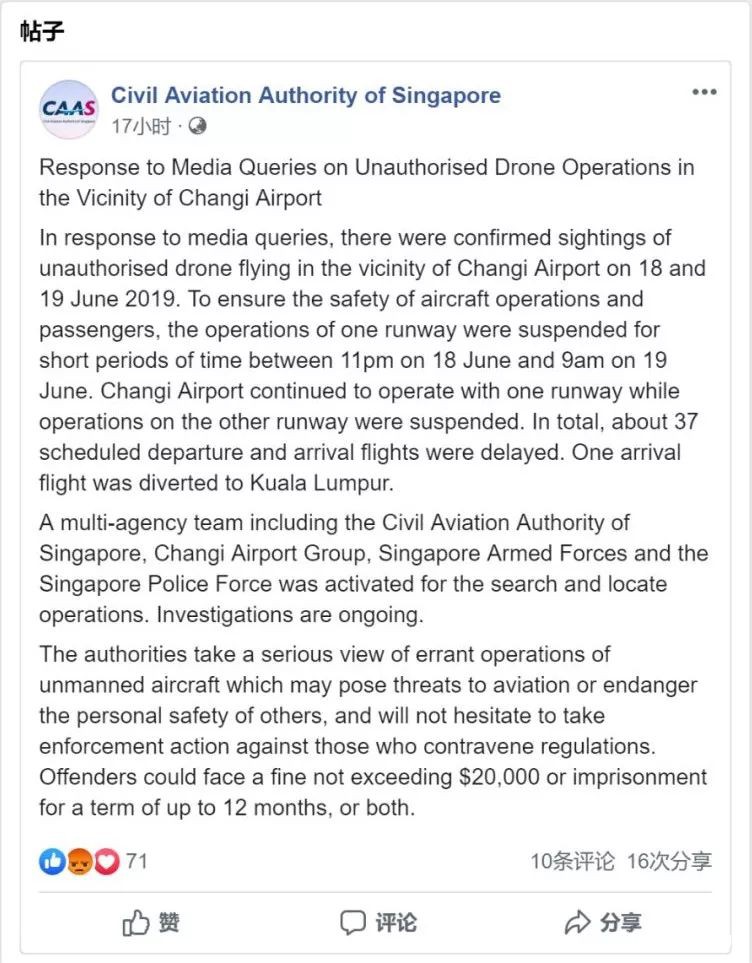 今天,新加坡民航局(CAAS)在脸书发帖表示,近两日在樟宜机场附近发现的不明无人机飞行时候造成航班延误的原因。