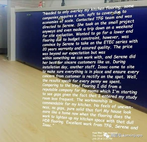 (翻译:我只需要铺厨房地板,但有的公司嫌活儿太小,根本不接。我联系了TFG团队,Serene是对接人,不仅接手了我这个小项目,还特地在周末来到现场查看情况。因为经费有限,我想要找一个稍微低端一点的地板,但是,Serene建议我使用ETEC系列的地板,不仅质量有保证,还有保修期。虽然价格超过了我们的计划,Serene帮助我们尽量控制住超额的部分。