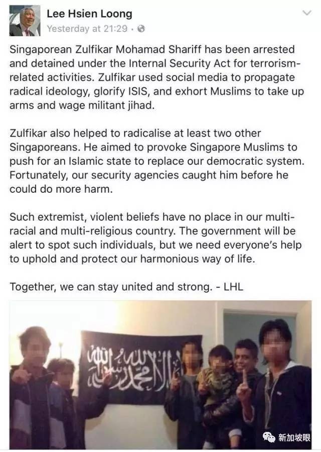 4,2016年7月30日,新加坡逮捕了在Facebook页面鼓吹圣战、洗脑他人参与恐怖活动的楚菲卡。当时,李显龙还专门发表长文,谴责以楚菲卡为首恐怖分子的卑劣行径。