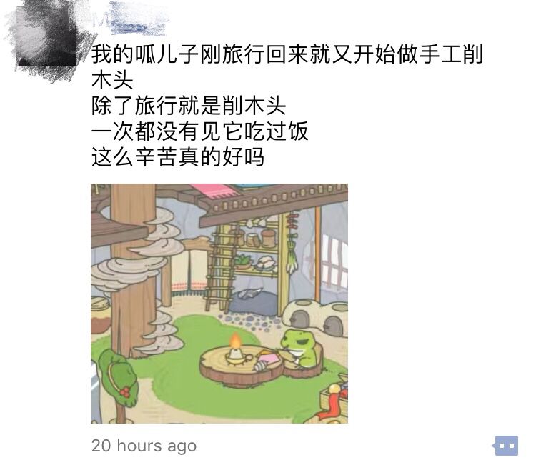 他来自一款超火爆的手机游戏《旅行青蛙》(旅かえる),是只爱旅行的青蛙。只要给他准备好口粮,他就外出旅行了。而我除了等待,就还是等待,等蛙儿子给我带回来它旅行的照片和土特产……
