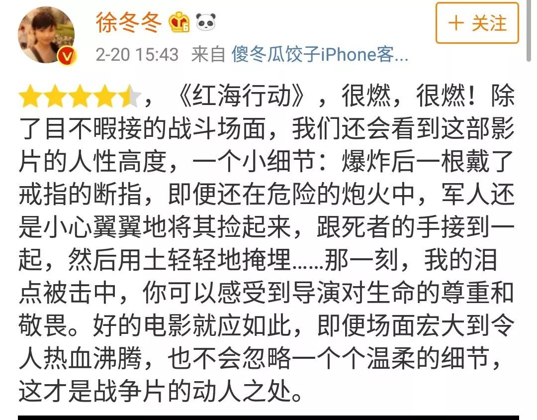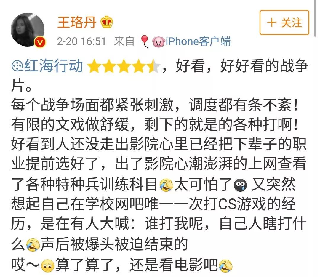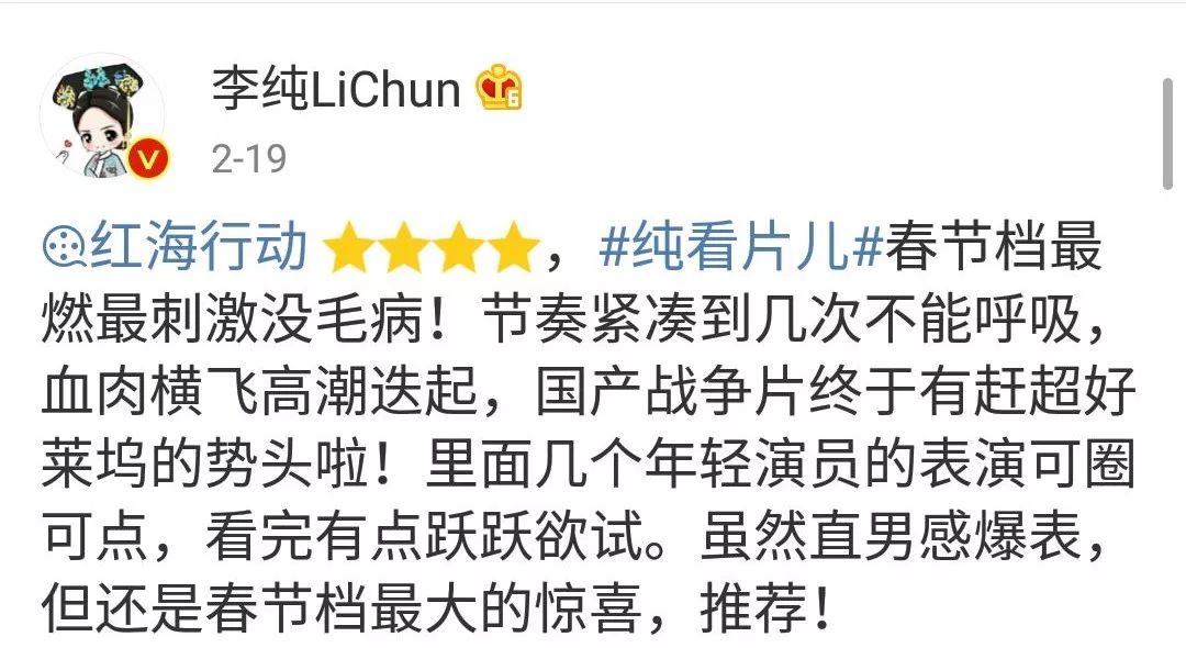 也还有网友将它与《战狼2》对比,说看完《战狼》,想让人参军打仗;看完《红海行动》让人向往和平,因为它真正让人看到了战争的残酷。