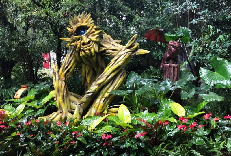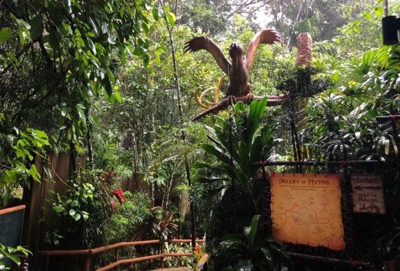 1、步行沿着有草棚的小径看树梢小径和龙与神兽景区。