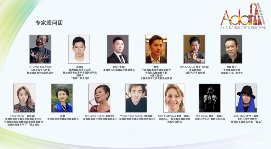 (新加坡戏曲学院创院院长Dr.Chua Soo Pong、亚洲舞蹈艺术节主席胡海泉先生、星海音乐学院舞蹈学院副院长胡骁先生、中国舞蹈家协会街舞委员会常务副主任兼秘书长/中国文化部世界民族文化交流促进会理事夏锐先生、著名韩国编舞家/纽约大学客座教授 Sun Ock Lee博士、中国舞蹈家协会党组副书记,秘书长罗斌先生、新加坡莱佛士音乐学院舞蹈系主任/中国驻新加坡大使馆艺术团荣誉顾问/亚洲舞蹈艺术节总策划 Nina Wong女士、中央民族大学舞蹈学院副院长杨敏教授、新加坡南洋艺术学院舞蹈系主任 Dr. Caren Carinoz、新加坡莱佛士音乐学院学术部主任 Wong Yong Foong先生)