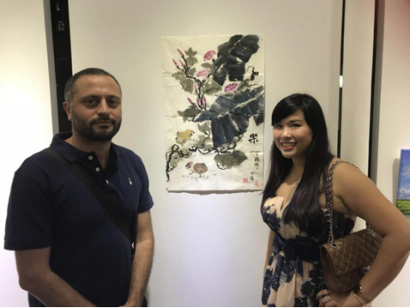 来自新加坡的马来族艺术家Suhat Sugiyou与女儿在自己创作的表达生命诞生的作品前留影