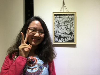刚刚13岁上中一的郭子悦是此次入围前二十名的年纪最小的获奖者,她对能够获奖感到意外又开心,她的作品是用黑色勾边笔创作的新春快乐,小小年纪的她也尝试各种风格的绘画,非常快乐自信。
