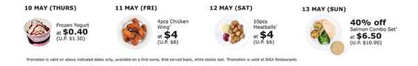 没有会员卡的小伙伴,宜家并没有冷落你们。从10号到13号,每天都有特价美食,而且都是最受欢迎的餐品。4毛钱的酸奶冰淇淋啦,6块5的三文鱼套餐啦……我肯定是要赶在肉丸打折那天去的!