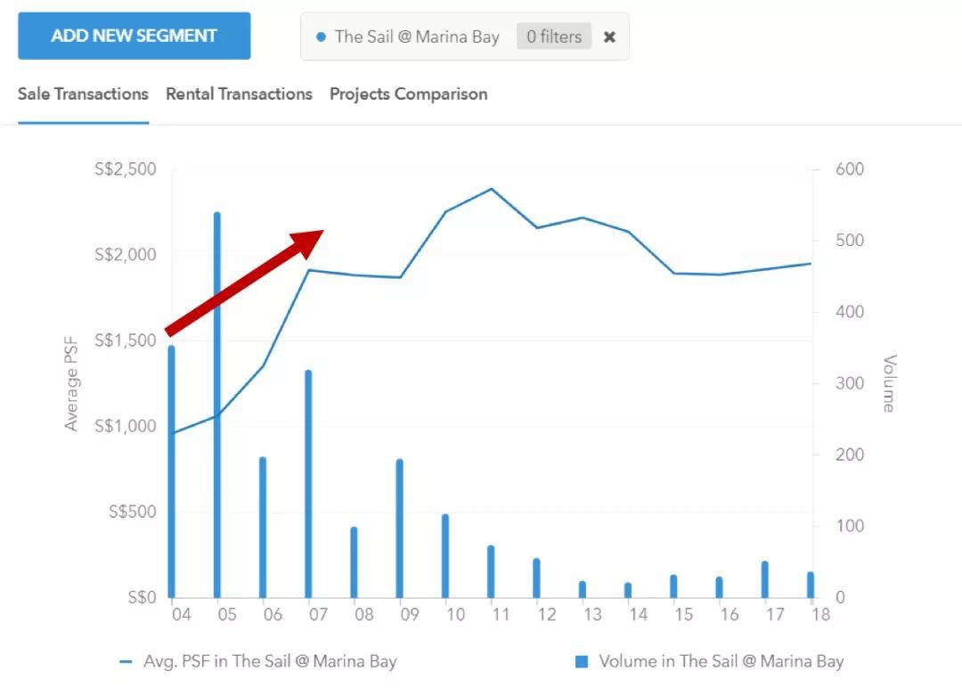 ↑ Marina Bay 从出售到竣工时价格上升幅度最大