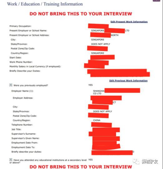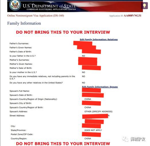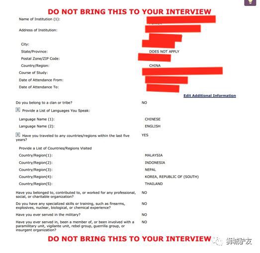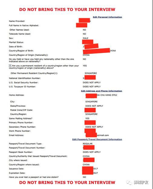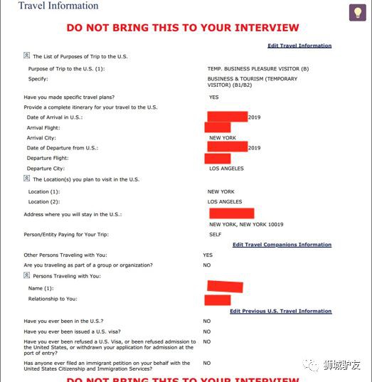 正方形的美国签证2寸照片2张,包含电子版的照片护照。如果护照是在最近5年内申请/更换的,请把之前旧护照也准备好家庭成员详细信息,父母的姓名,生日,已婚的配偶姓名,生日,居住地址随行人员的详细信息,建议加入一位随行人员,旅行社的机票行程单,酒店预订单(告知大概出行日期旅行社可以做,一份详细的旅行计划)工作经历现在的工作详情,之前一份工作的详情 在职证明或者在读证明,(在职工作的详细地址,电话,职位,从事工作的介绍,入职时间)最高学历,毕业的学校,地址,电话.学习的专业,入学时间,毕业时间最近5年到访的国家地区全部列出.以下为我填写完成后的截图,仅供参考。