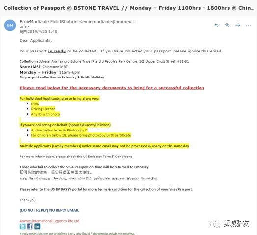 取护照一般是一周内就会邮件通知你取护照了,取护照的地址就是预约时选择的。我是第二天早上就收到邮件了,邮件内容如下: