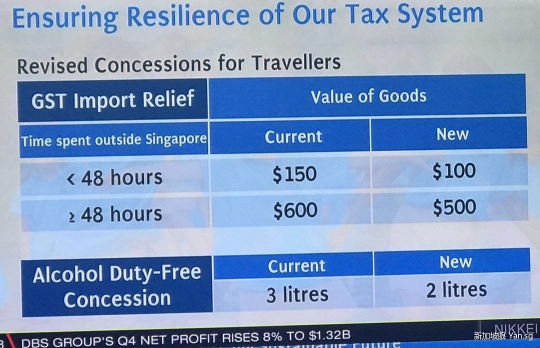 根据2019年新加坡财政预算案,出境新加坡少于48小时的消费税免税额从150新币减至100新币;出国48小时或以上则从600新币减至500新币。