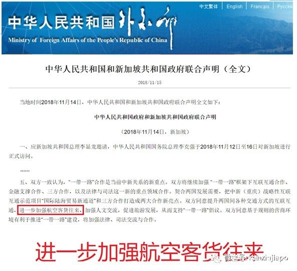 其中的第五段就很明确说:“一带一路”合作是当前中新关系的新重点。双方将继续加强 “一带一路”框架下互联互通合作……双方同意提升两国间各种交通方式的互联互通,进一步加强航空客货往来,加强人文交流,促进旅游发展,从而支持“一带一路”倡议。