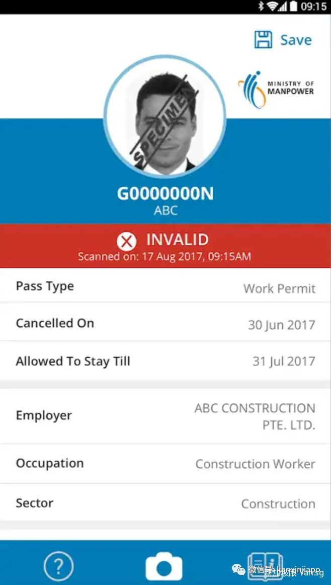 如果不幸被雇主CUT掉了工作准证,你扫描出来的结果就会显示为红色的无效。上面会清楚地显示,准证被取消的时间,还有依法可以呆在新加坡的时间。
