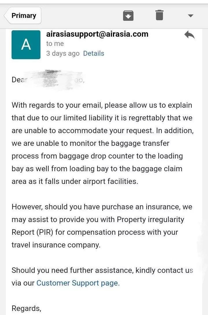 首先,亚航表示自己的工作人员职责有限,没能及时满足顾客的要求。另外,对于行李的损坏,亚航表示公司无法监视行李箱托运过程,不知道具体是哪个环节导致行李箱损坏。如果对方买了保险的话,公司愿意提供行李事故报告书(Property Irregularity Report)让对方找保险公司索赔。