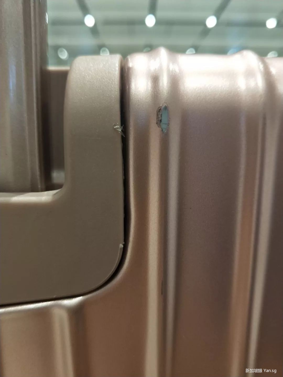 可以看到行李箱的拉杆处等,有多个擦痕…….