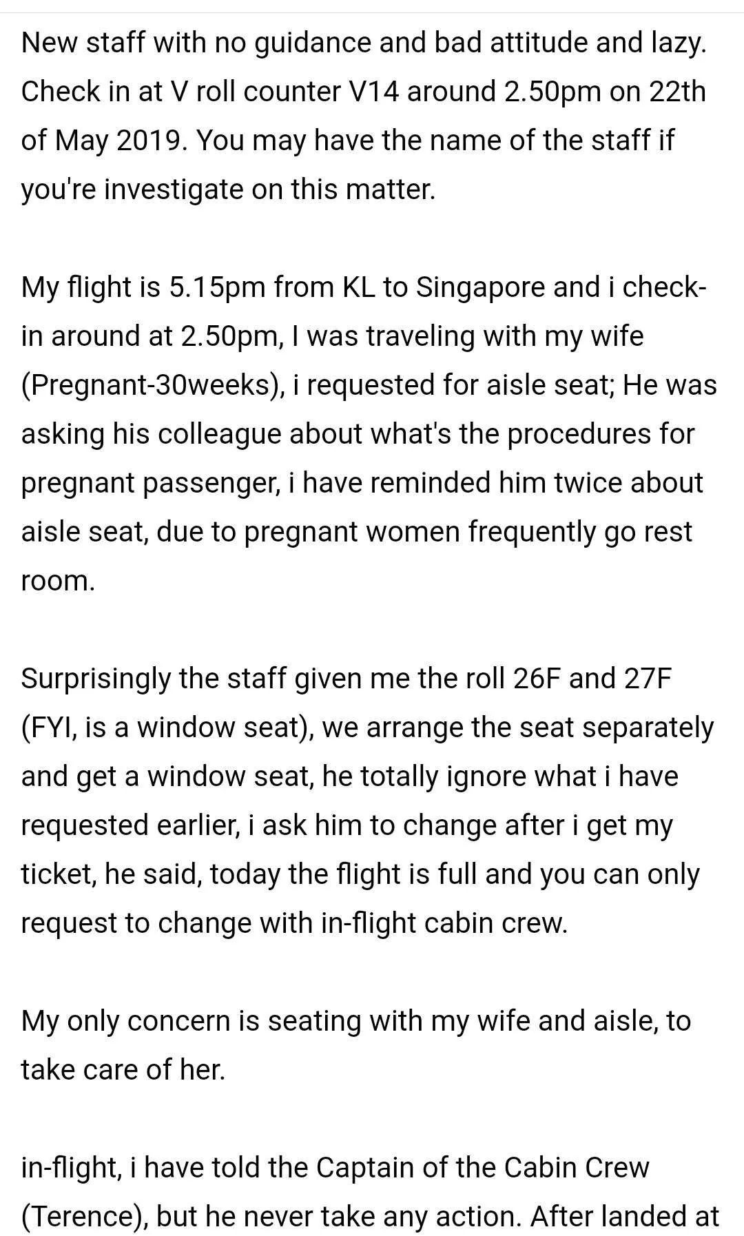 Lili丈夫在信中反映了两个不满的方面:一是关于亚航服务的,妻子怀孕了30周,他向机场工作人员要求靠走道的座位却没有得到满足,飞机上和机长沟通协调无果。