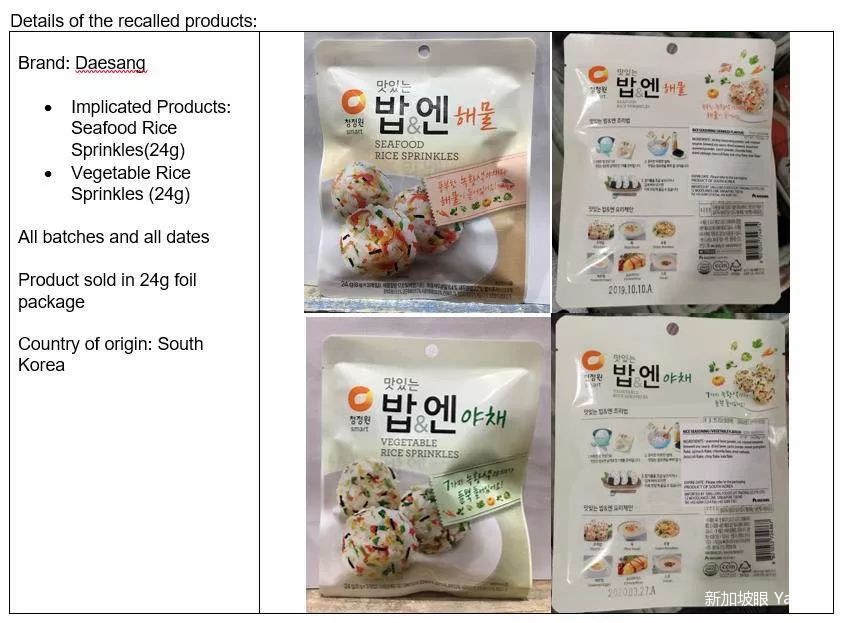 ▲被召回的是24克装的海鲜味饭团调料和蔬菜味饭团调料,图源:新加坡食品局官方脸书