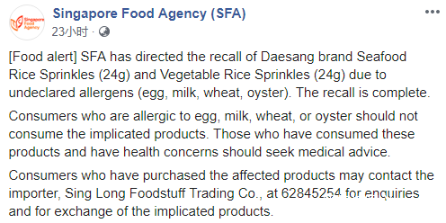 据了解,这两款来自韩国品牌Daesang的饭团调料,含有未申报的过敏原(鸡蛋、牛奶、小麦,牡蛎)。所以食品局对此进行了紧急召回,避免流入市场造成更多隐患。
