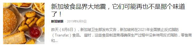 新加坡政府对食品安全一向把控甚严,不久前才宣布要在2021年全面禁止反式脂肪食品。