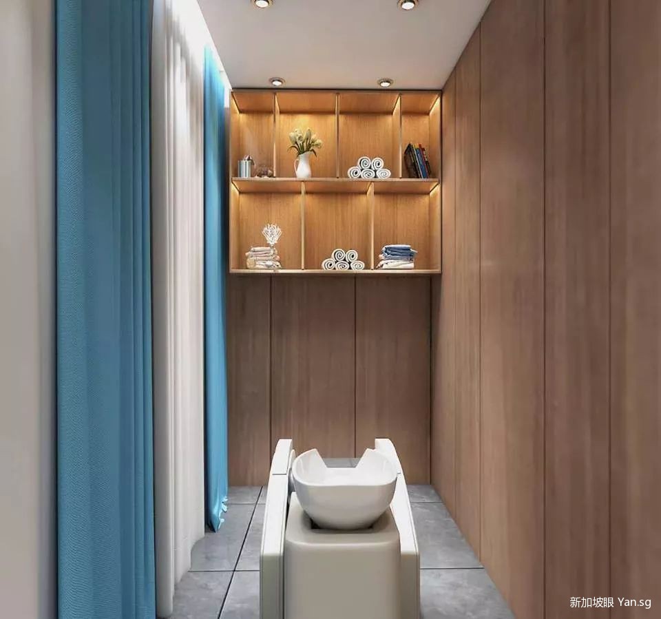 洗发间的布置如下……选择有窗户处做隔间,尽管空间不大,却不让人觉得闷气,有通透感。