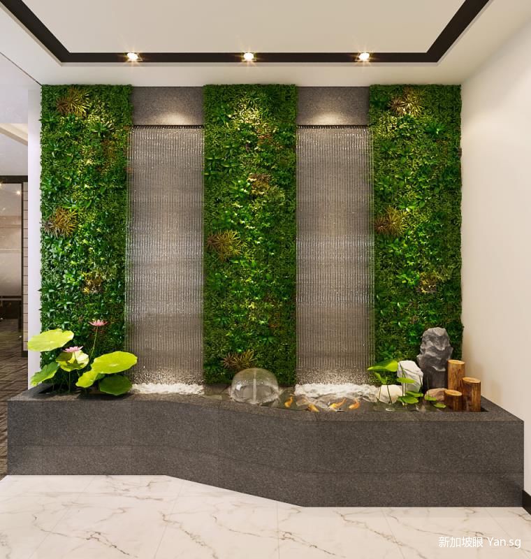 背景墙打造出流水高处落下的景象,水流入有锦鲤、荷花的水池中,有聚财吉祥之意,既美观又讨生意好兆头。