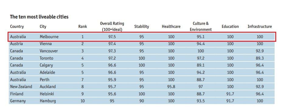 墨尔本不但教育搞得出色,生活环境也是世界第一,已经在世界最宜居城市榜,霸榜七年,难逢敌手。在基础设施,医疗教育获得了满分,以97.5接近满分的姿态获得冠军。让人忍不住想去看看到底是多适合居住。