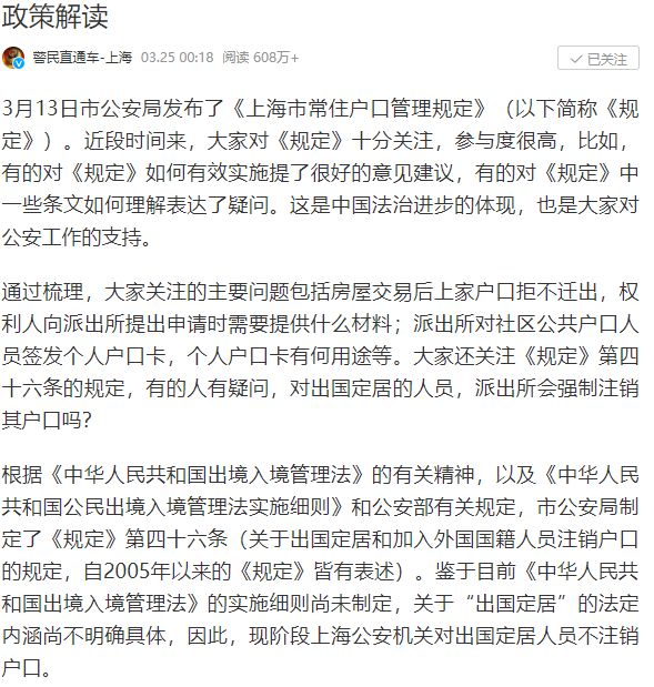 昨天,上海市公安局微博(警民直通车-上海)半夜发布消息:现阶段上海公安机关对出国定居人员不注销户口。
